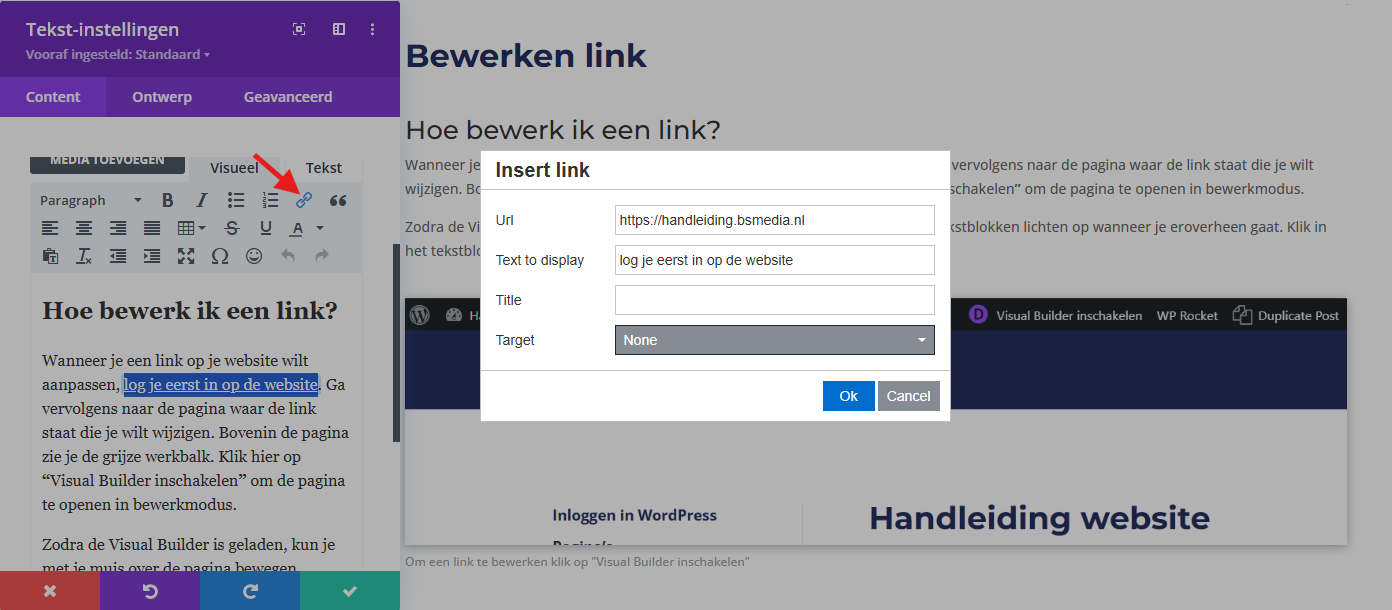 Om een link te bewerken klik op “Visual Builder inschakelen”