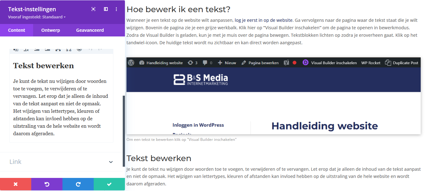 Wanneer je een tekst op de website wilt aanpassen, log je eerst in op de website. Ga vervolgens naar de pagina waar de tekst staat die je wilt wijzigen. Bovenin de pagina zie je een grijze werkbalk. Klik hier op “Visual Builder inschakelen” om de pagina te openen in bewerkmodus.